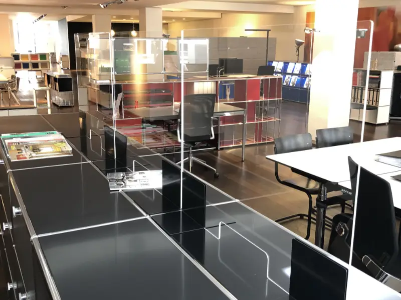 Auch nach Corona nutzen viele Unternehmen noch Schutzaufsätze im Empfangs-oder Tresenbereich. Hier passen sich die modularen Produkte von USM optimal Ihren individuellen Bedürfnissen an. Auch jetzt ist es weiterhin wichtig, die Gesundheit von Kunden und Mitarbeitern optimal zu schützen. Hierzu passen die neuen Schutzaufsätze von USM perfekt. Egal ob Sie Ihre Theke, oder die Arbeitsplätze Ihrer Mitarbeiter schützen wollen, das USM System bietet eine Lösung.
