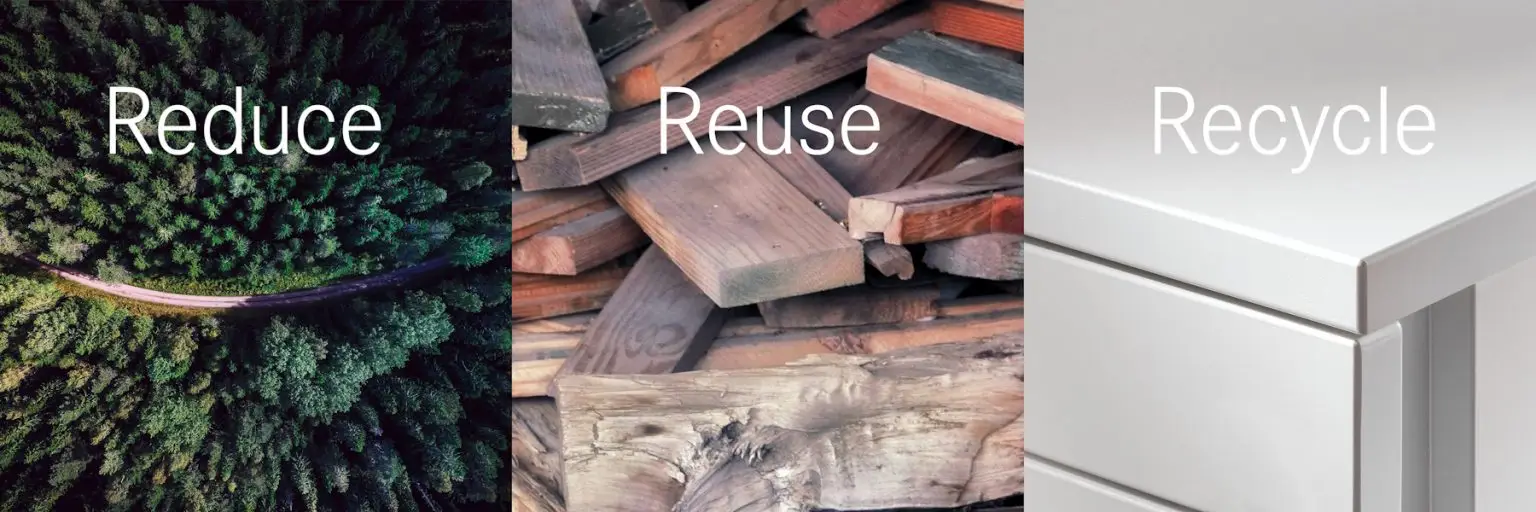 Auch die Firma Wini Büromöbel hat sich das  Grundprinzip der Kreislaufwirtschaft auf die Fahne geschrieben: Reduce, Reuse und Recycle