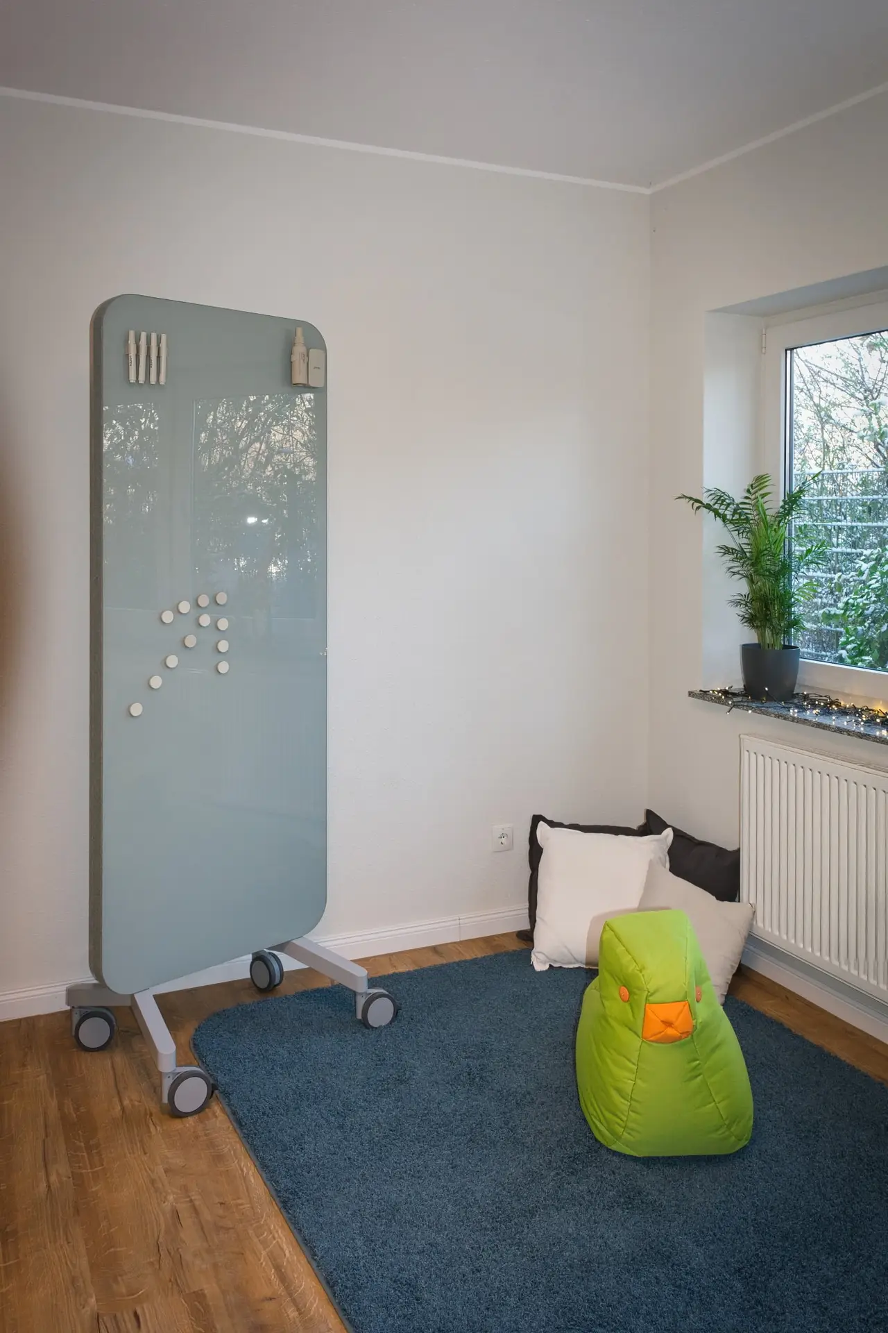 Wir setzten uns also zusammen mit Frau Nieselt, der Leitung des Therapiezentrums und der Innenarchitektin Frau Wahlen. Dank dieser vertrauensvollen Zusammenarbeit und dem engen Austausch, sowie den Erfahrungen der leitenden Mitarbeiterin, entstand eine sehr runde und schöne Gestaltung der kompletten Innenausstattung. Von Büro über Küche und Spielzimmer, bis hin zu dem großen Wartebereich, dem Herzstück der Praxis, wurden neue Möbel geplant und aufeinander abgestimmt. Das Ergebnis ist ein überaus harmonischer Gesamteindruck, gemütlich für Kinder und schick zugleich. Darüber hinaus sind alle Zimmer auch funktionell durchdacht und daher im Alltag praktisch.